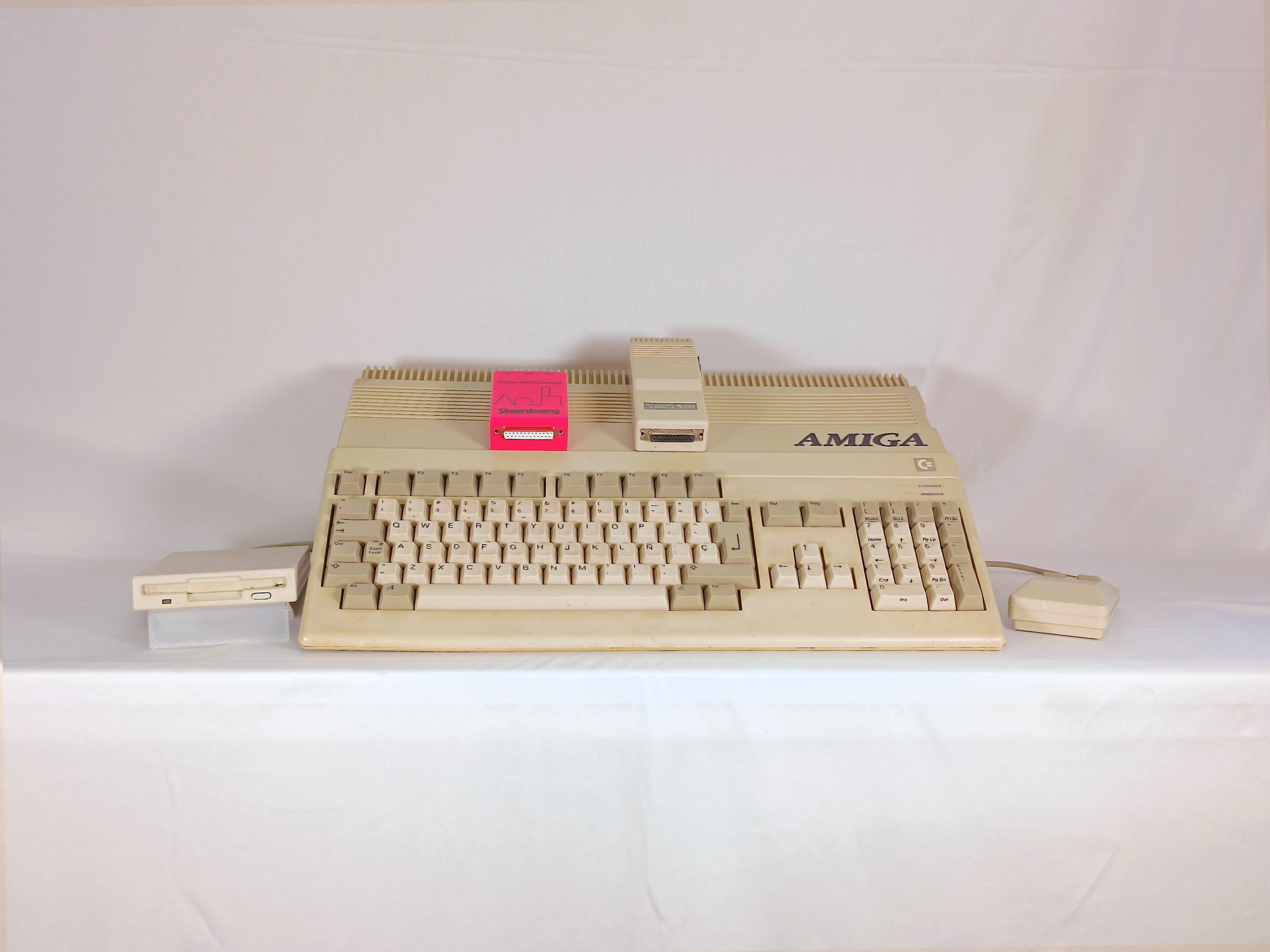 En la foto se observa el ratón original, el modulador de televisión (para conectar a una tv por antena, aunque también tenía salida RGB para Euroconector), disquetera externa de 3 1/2 (también tenía de 5 1/4, y modelos posteriores, compatibilidad SCSI para discos duros y demás dispositivos de almacenamiento), y un controlador MIDI, de la marca Steinberg, creadora de Cubase, aunque curiosamente, nunca llegó a salir para este sistema, pero si para su archienemigo AtariST (el modelo 520 llevaba un controlador MIDI incorporado).
